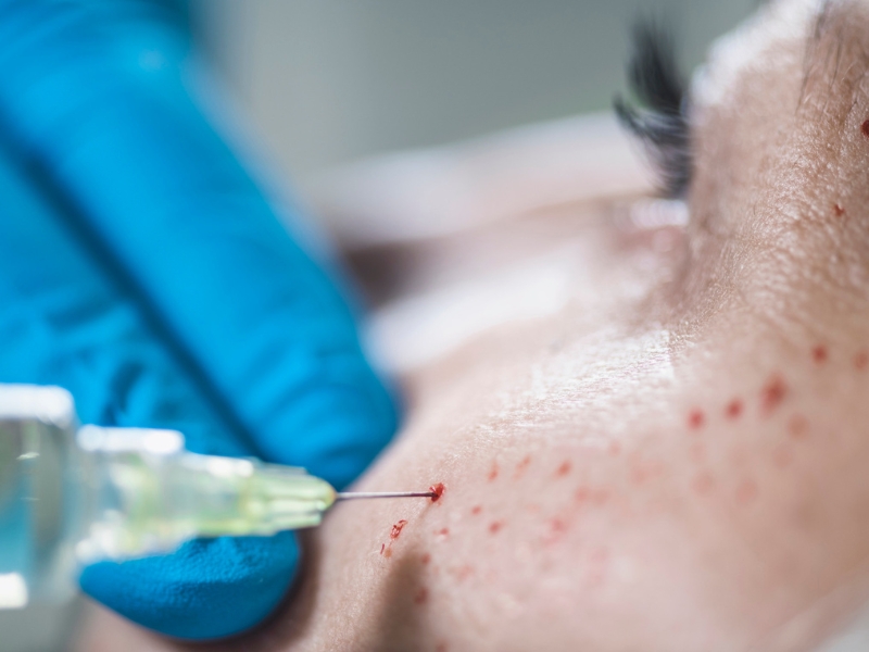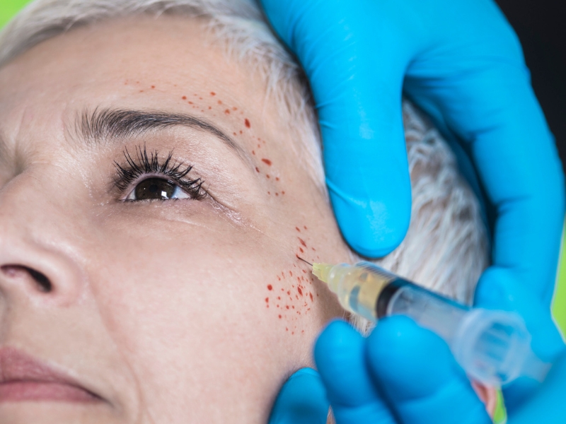 Vampire Facial skin treatment. Also known as a PRP facial, this treatment involves drawing a small amount of the patient's blood, processing this blood to concentrate the platelets, and then re-injecting the platelets back into the skin. The growth factors in the concentrated platelets can stimulate collagen production and improve skin tone, texture, and overall appearance.